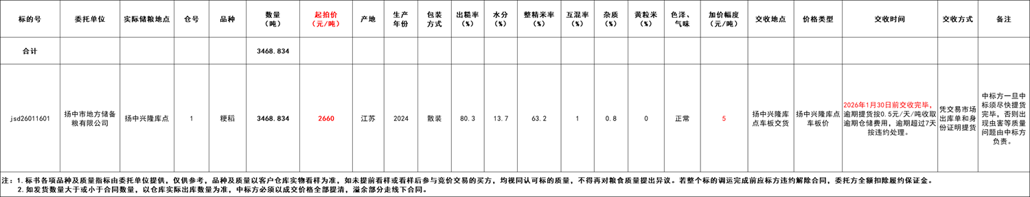中標(biāo)方成交后將貨款匯至交易市場(chǎng)賬戶(hù)(與保證金賬戶(hù)一致)并申請(qǐng)出庫(kù)單,憑市場(chǎng)出庫(kù)單和身份證明到委托方指定庫(kù)點(diǎn)提貨,交割完成后雙方憑雙方確認(rèn)單到交易市場(chǎng)退保證金(保證金不沖抵貨款,待合同履約結(jié)束后統(tǒng)一釋放)。交款、交割期為合同成交之日起至2026年1月30日前,逾期提貨按0.5元/天/噸收取逾期倉(cāng)儲(chǔ)費(fèi)用,逾期超過(guò)7天按違約處理。買(mǎi)受人須提前聯(lián)系委托方,由買(mǎi)賣(mài)雙方協(xié)商確定具體提貨時(shí)間。如遇特殊情況,雙方協(xié)商。中標(biāo)方一旦中標(biāo)須盡快提貨完畢,否則出現(xiàn)蟲(chóng)害等質(zhì)量問(wèn)題由中標(biāo)方負(fù)責(zé)。