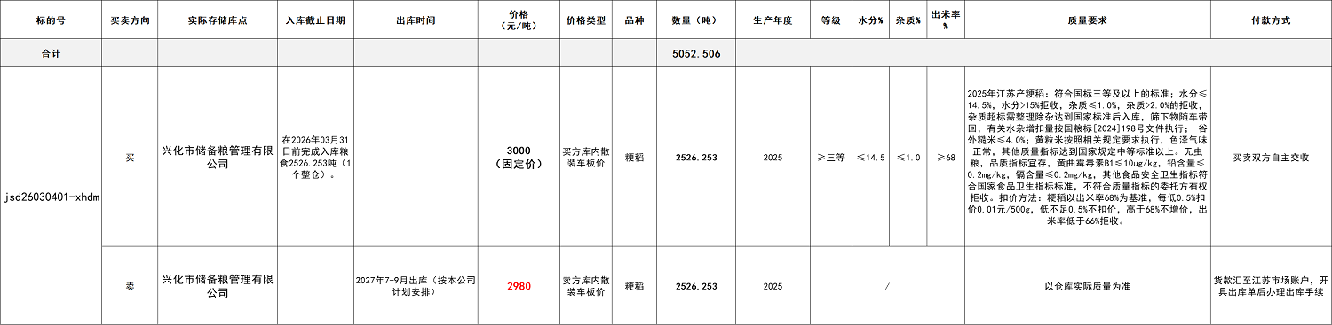銷售輪出的糧食為本次采購(gòu)的在未來時(shí)點(diǎn)輪出的糧食,具體輪出時(shí)間詳見線下協(xié)議,輪出價(jià)格為本次競(jìng)價(jià)產(chǎn)生,設(shè)定交易底價(jià)為倉(cāng)庫(kù)車板價(jià):粳稻:2980元/噸(具體詳見交易清單)。