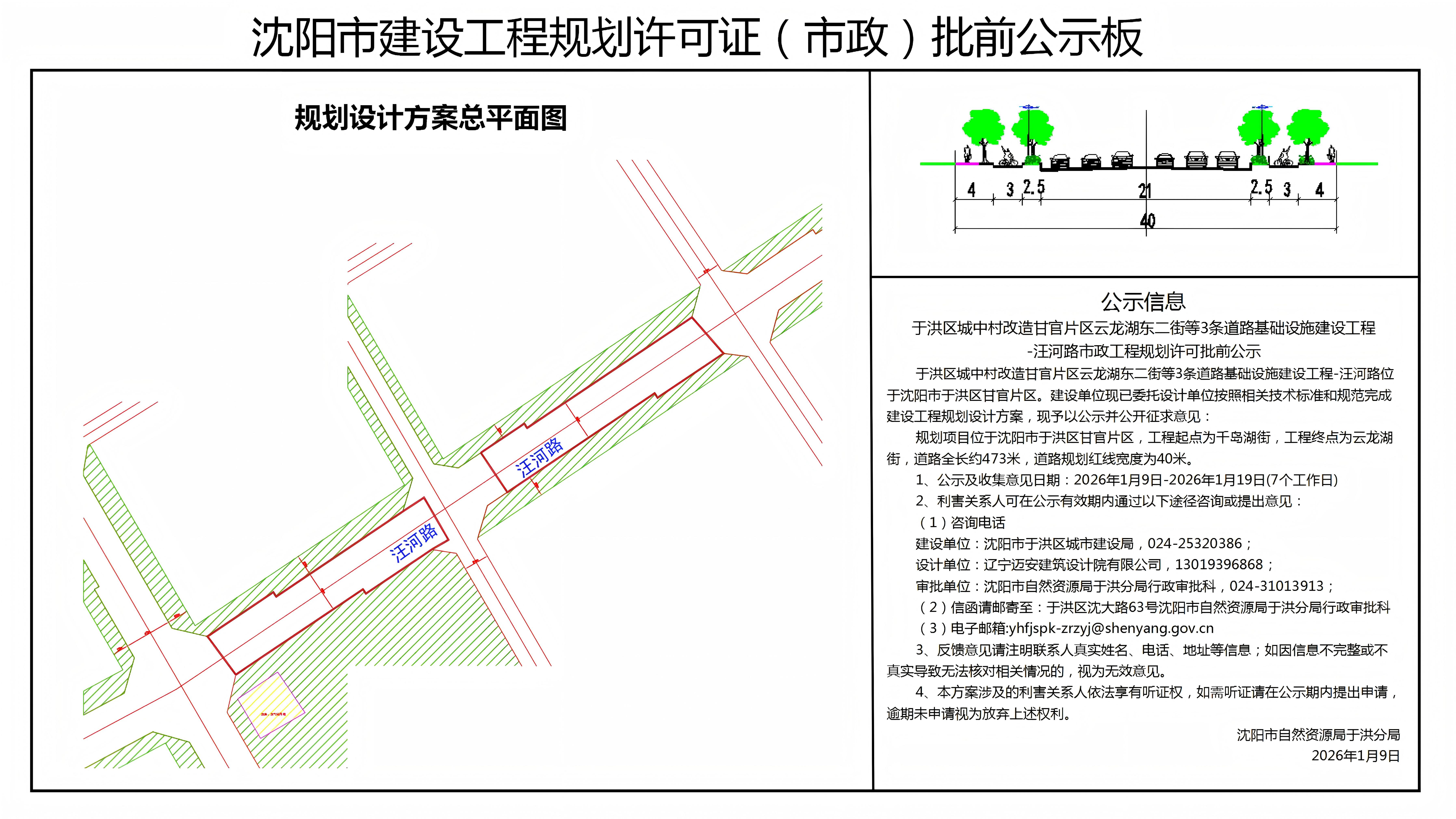于洪區(qū)城中村改造甘官片區(qū)云龍湖東二街等3條道路基礎(chǔ)設(shè)施建設(shè)工程-汪河路位于沈陽市于洪區(qū)甘官片區(qū)。建設(shè)單位現(xiàn)已委托設(shè)計單位按照相關(guān)技術(shù)標準和規(guī)范完成建設(shè)工程規(guī)劃設(shè)計方案,現(xiàn)予以公示并公開征求意見: