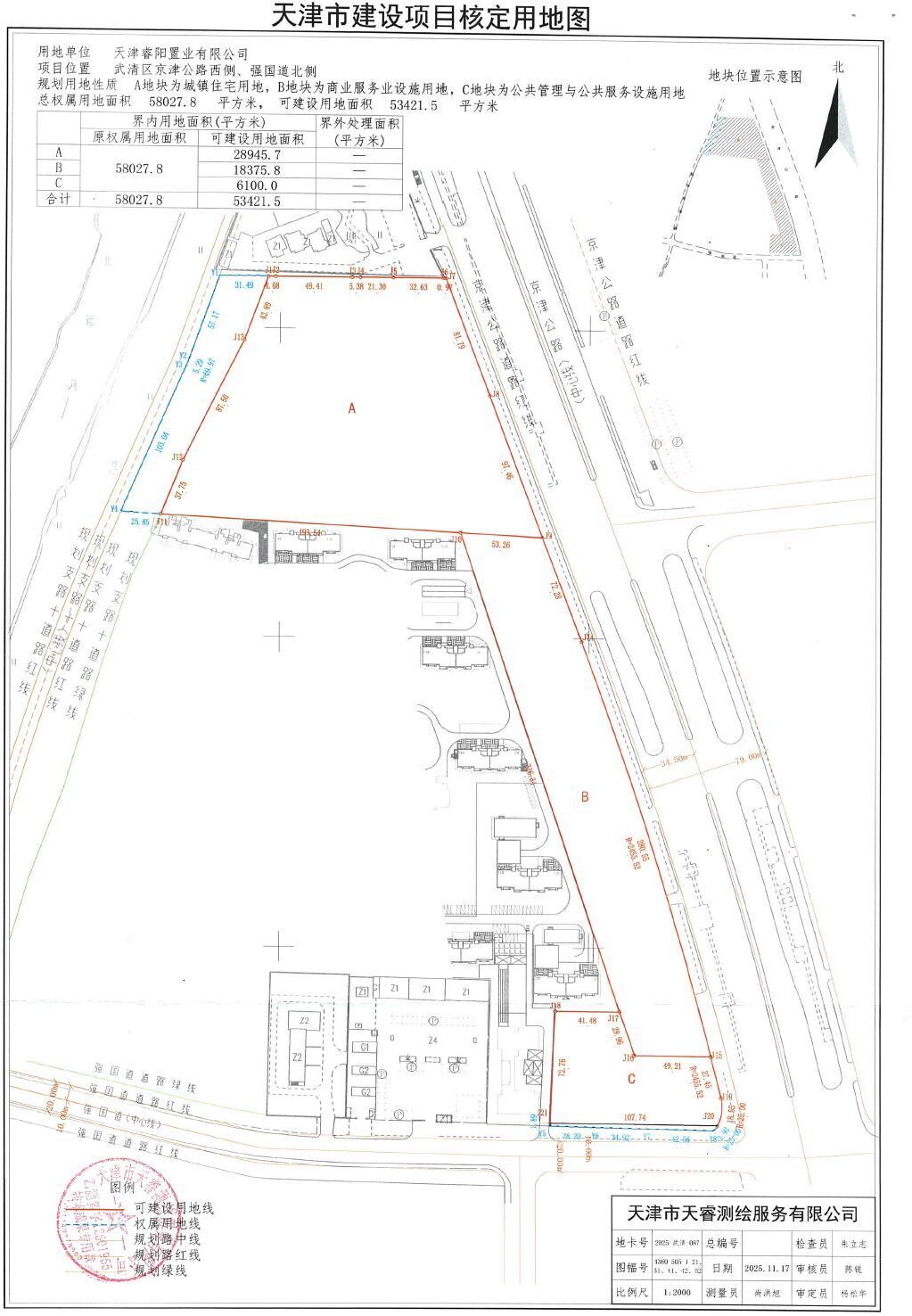 ******居住項(xiàng)目、08-25B商業(yè)服務(wù)業(yè)設(shè)施用地、08-25C公共管理與公共服務(wù)設(shè)施用地項(xiàng)目位于京津公路西側(cè)、強(qiáng)國道北側(cè),規(guī)劃條件通知書編號(hào)為2026武清規(guī)條申字0002,其中08-25A地塊用地性質(zhì)為城鎮(zhèn)住宅用地,用地面積28945.7平方米,容積率≤1.8,綠地率≥40%,建筑密度≤28%,08-25B地塊用地性質(zhì)為商業(yè)服務(wù)業(yè)用地,用地面積18375.8平方米,容積率≤2.4,08-25C地塊用地性質(zhì)為公共管理與公共服務(wù)用地,用地面積為6100平方米,容積率≤1.8,綠地率≥35%。