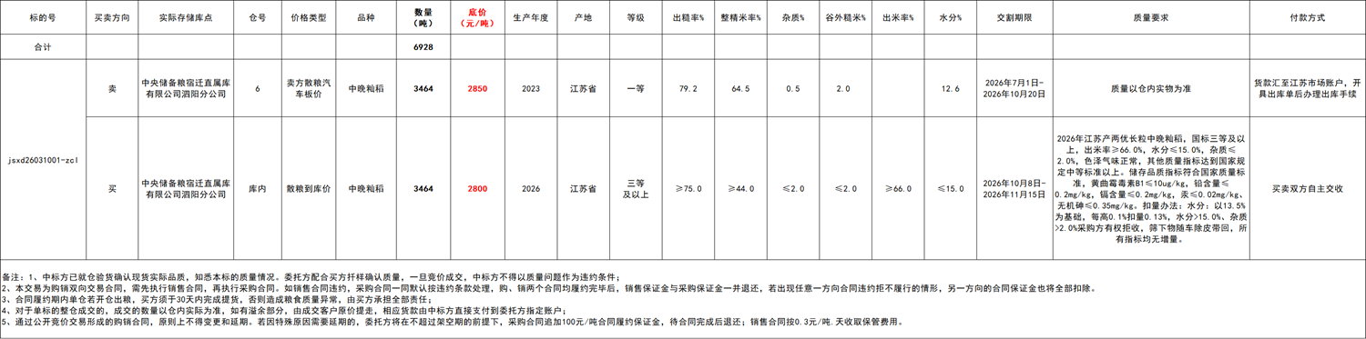 本次交易采用購銷雙向競價(以采競銷)模式,即委托方與競價方通過一次交易同步實現(xiàn)同等數(shù)量糧油的采購和銷售。以采競銷模式下,競價參與方只對銷售標的底價進行競價,一旦銷售標的物應價成交,則相應采購標的物以交易清單中公布的價格成交,銷售價格以競價交易結果為準。通過一次交易實現(xiàn)購銷雙向交易合同。競價參與方須仔細閱讀本交易公告、清單及其他相關文件,謹慎評估自身風險承擔能力和市場、政策風險,衡量決定是否參與交易,一旦參與,須承擔相應的風險和責任,自覺履行相關義務。中標方須保證輪出糧食流向符合國家有關規(guī)定,并不得用作中央和各級地方儲備糧食的輪入,否則一切法律和政策責任全部由中標方自行承擔。