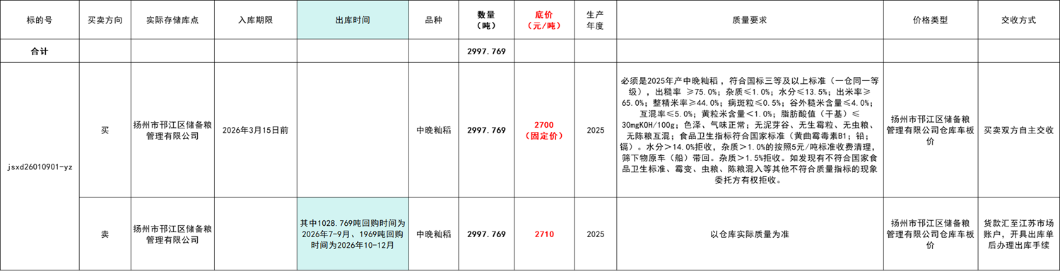 銷售輪出的糧食為本次采購(gòu)的糧食在未來(lái)時(shí)點(diǎn)輪出的糧食,輪出價(jià)格為本次競(jìng)價(jià)產(chǎn)生,******有限公司倉(cāng)庫(kù)車板價(jià),中晚秈稻2710元/噸(其中1028.769噸回購(gòu)時(shí)間為2026年7-9月,1969噸回購(gòu)時(shí)間為2026年10-12月)。競(jìng)購(gòu)方必須在20日歷日內(nèi)提完,避免動(dòng)倉(cāng)后糧食質(zhì)量下降,如因競(jìng)購(gòu)方未按要求及時(shí)提貨造成的糧食質(zhì)量等損失均由競(jìng)購(gòu)方負(fù)全責(zé)(具體參見線下合同)。