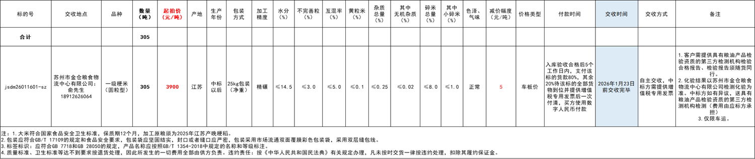 受******有限公司委托, ******有限公司作為采購方,江蘇糧油商品交易市場暨蘇州分市場定于2026年1月16日?10:45舉辦本次地方儲備粳米競價采購交易活動。具體事宜公告如下: